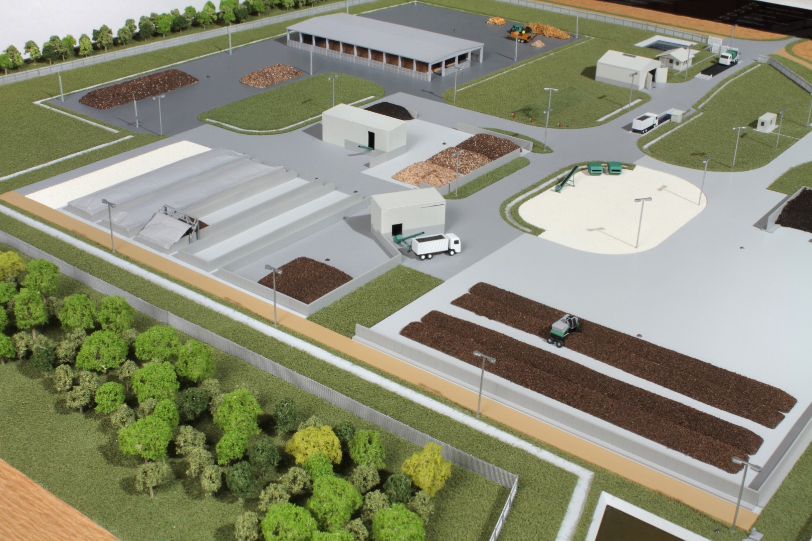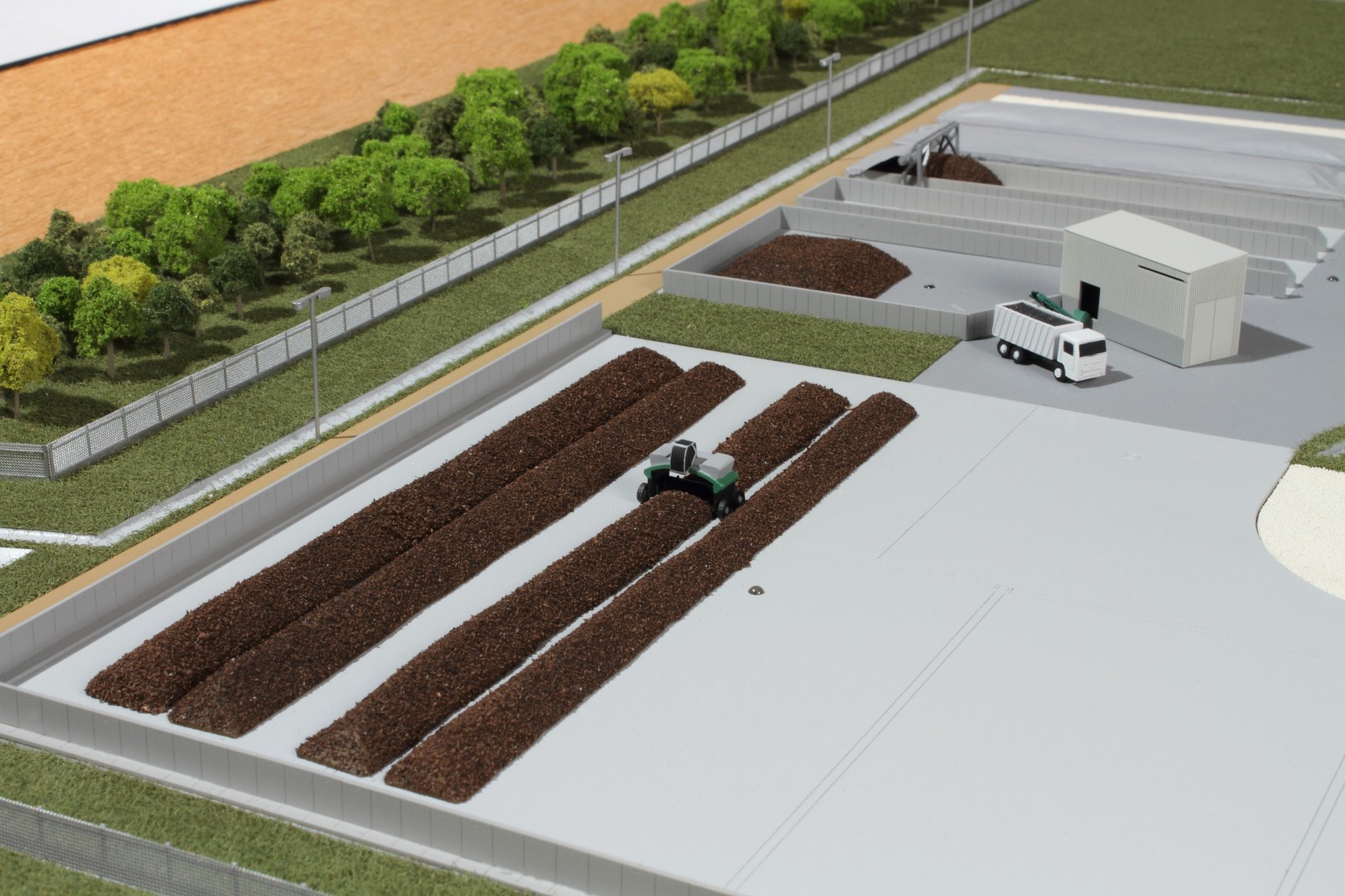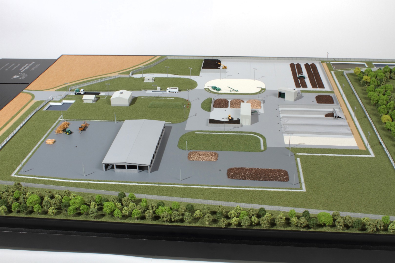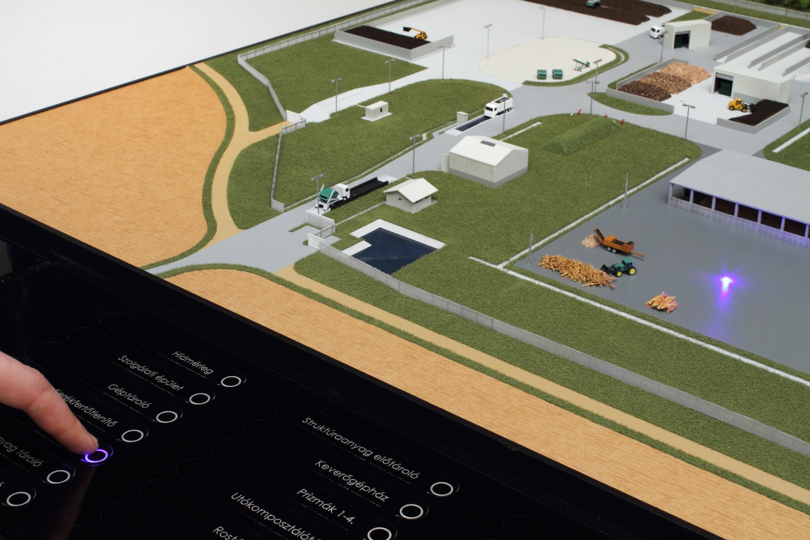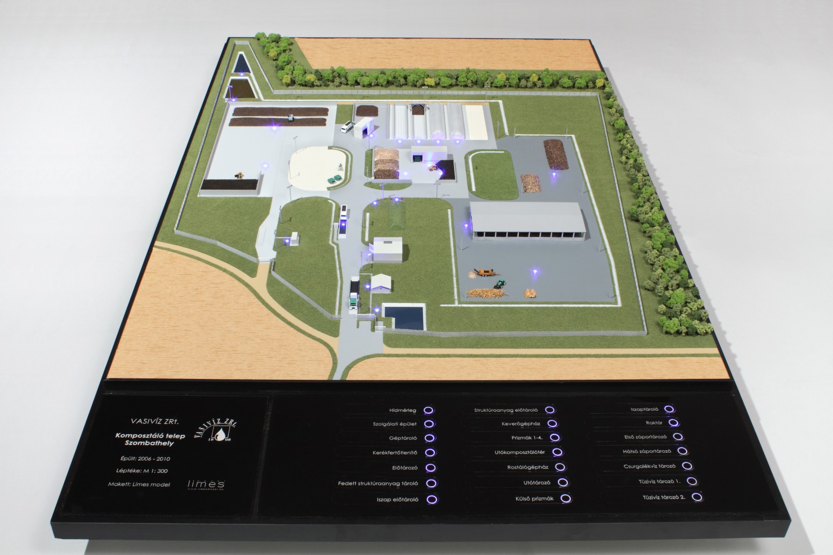 A Vasivíz Zrt. szennyvíztisztító telepén a biológiai folyamatok végén olyan szerves iszap keletkezik, ami további faaprítékkal keverve, rövid időn belül alkalmassá válik a mezőgazdasági talajerő visszapótlásra. A Vasivíz Zrt. figyelmet fordít a magas színvonalú technológiáinak szemléletes bemutatására, így a szennyvíztisztító mellett, a komposztáló telepéről is elkészíttette információs makettjét. Itt az egyes folyamatok nyomonkövethetőségét segítve magyarázó LED világítást készítettünk. A megbízás különös volt abból a szempontból, hogy ezen a telepen minden „kupacnak” jelentősége van, fontos a mérete, alakja, és még a színe is. Ez utóbbi jól látható a makett közepén található keverékeknél, amik a bennük található faapríték mennyiségében térnek el egymástól. Makettünkön 300 szoros kicsinyítésben egy üzemszerű állapotot mutatunk, ahol egy traktor épp táplálja a gigászi méretű faaprítót, egy homlokrakodó keveri a faaprítékkal az iszapot, egy másik már az elkészült komposztot deponálja, ami mellett egy sci-fi filmbe illő Topturn x53 keveri át a prizmában tárolt félkész komposztot. A járművek elkészítését különösen élveztük. A kicsit is hozzáértők már a színűk alapján felismerik a John Deere traktort, vagy a JCB homlokrakodót. A lézergépünk segítségével a Mercedes kamionra még a logó is felkerült. A járműveket a gyári katalógusuk alapján rajzoltuk meg alkatrészenként, és vágtuk ki plexiből, papírból.