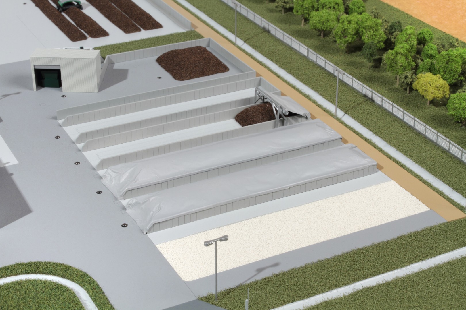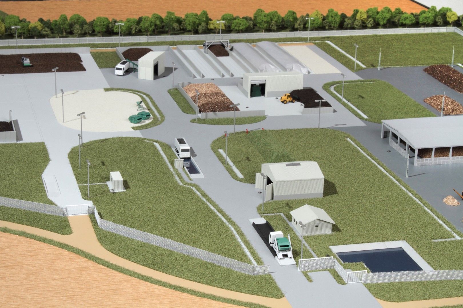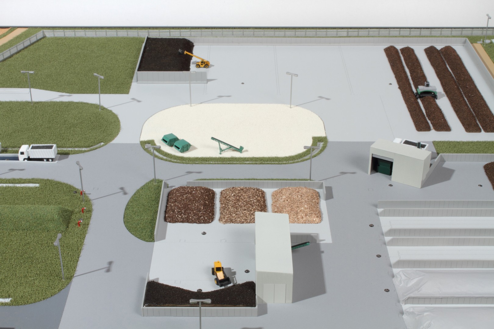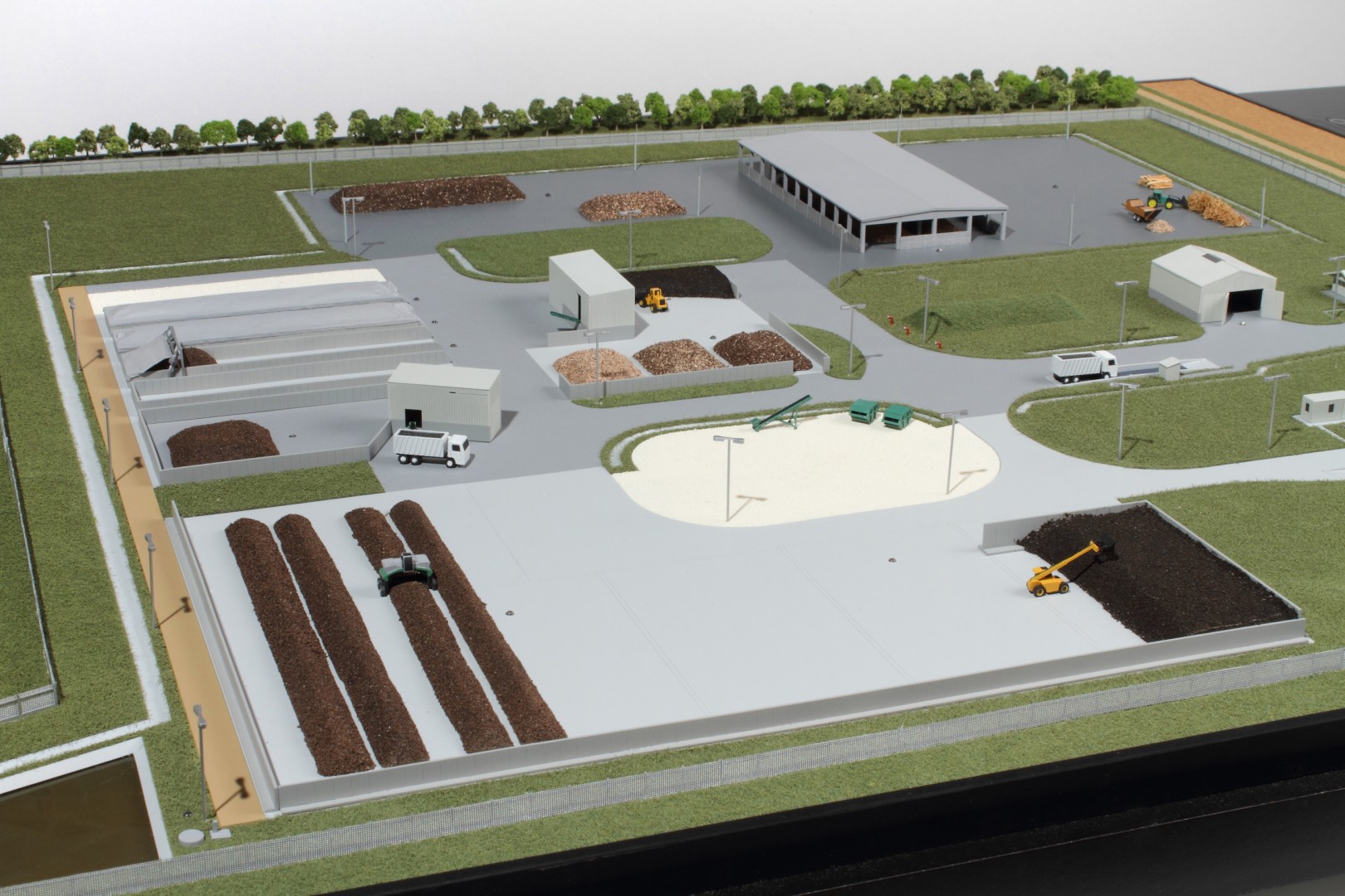 A Vasivíz Zrt. szennyvíztisztító telepén a biológiai folyamatok végén olyan szerves iszap keletkezik, ami további faaprítékkal keverve, rövid időn belül alkalmassá válik a mezőgazdasági talajerő visszapótlásra. A Vasivíz Zrt. figyelmet fordít a magas színvonalú technológiáinak szemléletes bemutatására, így a szennyvíztisztító mellett, a komposztáló telepéről is elkészíttette információs makettjét. Itt az egyes folyamatok nyomonkövethetőségét segítve magyarázó LED világítást készítettünk. A megbízás különös volt abból a szempontból, hogy ezen a telepen minden „kupacnak” jelentősége van, fontos a mérete, alakja, és még a színe is. Ez utóbbi jól látható a makett közepén található keverékeknél, amik a bennük található faapríték mennyiségében térnek el egymástól. Makettünkön 300 szoros kicsinyítésben egy üzemszerű állapotot mutatunk, ahol egy traktor épp táplálja a gigászi méretű faaprítót, egy homlokrakodó keveri a faaprítékkal az iszapot, egy másik már az elkészült komposztot deponálja, ami mellett egy sci-fi filmbe illő Topturn x53 keveri át a prizmában tárolt félkész komposztot. A járművek elkészítését különösen élveztük. A kicsit is hozzáértők már a színűk alapján felismerik a John Deere traktort, vagy a JCB homlokrakodót. A lézergépünk segítségével a Mercedes kamionra még a logó is felkerült. A járműveket a gyári katalógusuk alapján rajzoltuk meg alkatrészenként, és vágtuk ki plexiből, papírból.