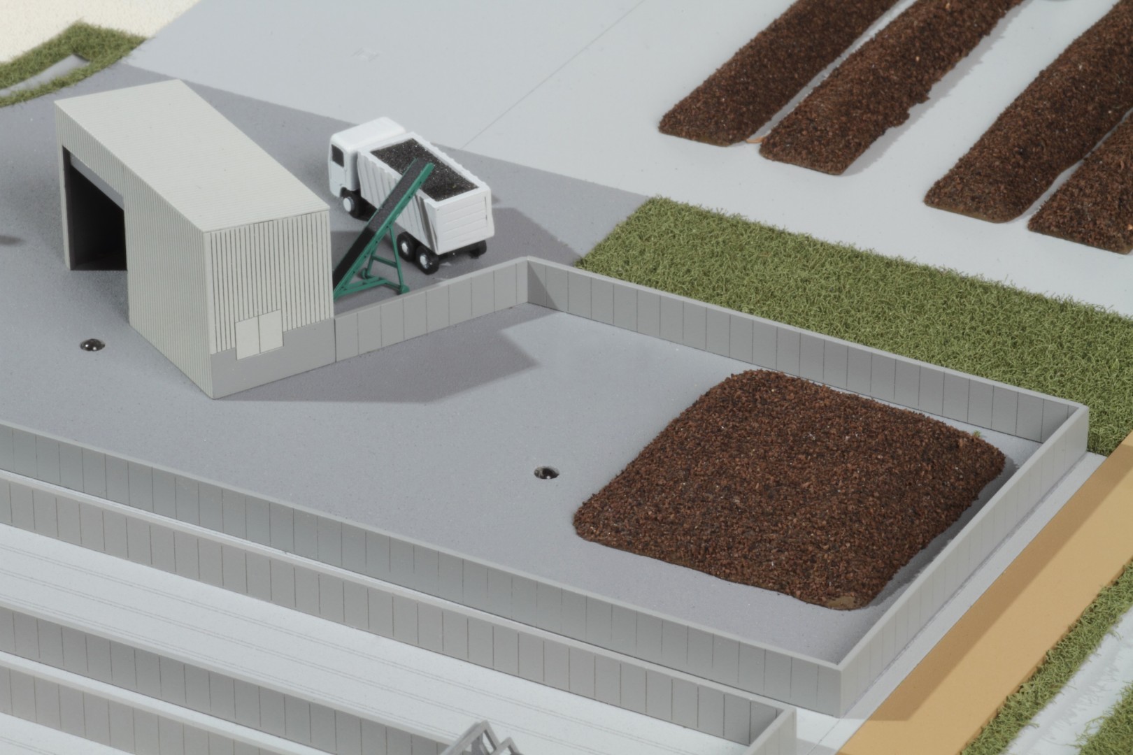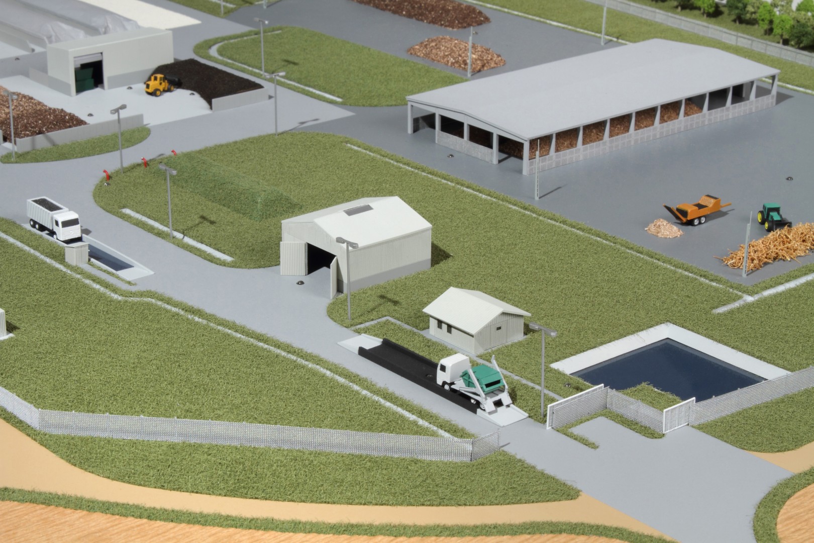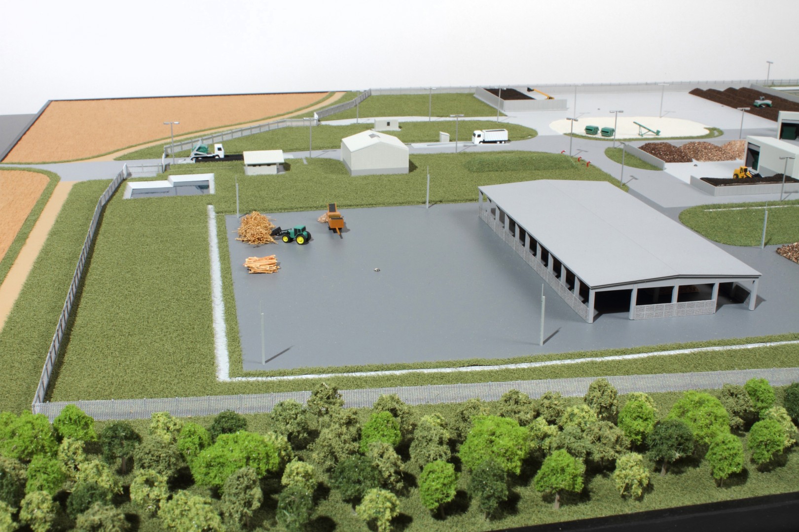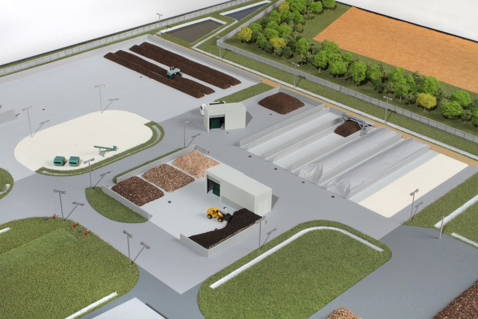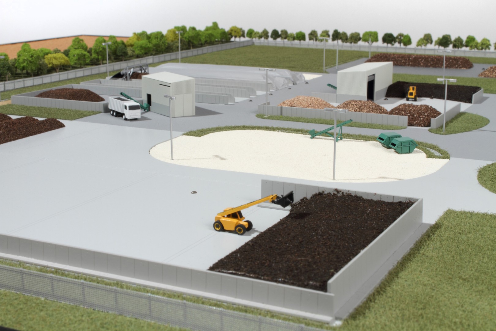 A Vasivíz Zrt. szennyvíztisztító telepén a biológiai folyamatok végén olyan szerves iszap keletkezik, ami további faaprítékkal keverve, rövid időn belül alkalmassá válik a mezőgazdasági talajerő visszapótlásra. A Vasivíz Zrt. figyelmet fordít a magas színvonalú technológiáinak szemléletes bemutatására, így a szennyvíztisztító mellett, a komposztáló telepéről is elkészíttette információs makettjét. Itt az egyes folyamatok nyomonkövethetőségét segítve magyarázó LED világítást készítettünk. A megbízás különös volt abból a szempontból, hogy ezen a telepen minden „kupacnak” jelentősége van, fontos a mérete, alakja, és még a színe is. Ez utóbbi jól látható a makett közepén található keverékeknél, amik a bennük található faapríték mennyiségében térnek el egymástól. Makettünkön 300 szoros kicsinyítésben egy üzemszerű állapotot mutatunk, ahol egy traktor épp táplálja a gigászi méretű faaprítót, egy homlokrakodó keveri a faaprítékkal az iszapot, egy másik már az elkészült komposztot deponálja, ami mellett egy sci-fi filmbe illő Topturn x53 keveri át a prizmában tárolt félkész komposztot. A járművek elkészítését különösen élveztük. A kicsit is hozzáértők már a színűk alapján felismerik a John Deere traktort, vagy a JCB homlokrakodót. A lézergépünk segítségével a Mercedes kamionra még a logó is felkerült. A járműveket a gyári katalógusuk alapján rajzoltuk meg alkatrészenként, és vágtuk ki plexiből, papírból.