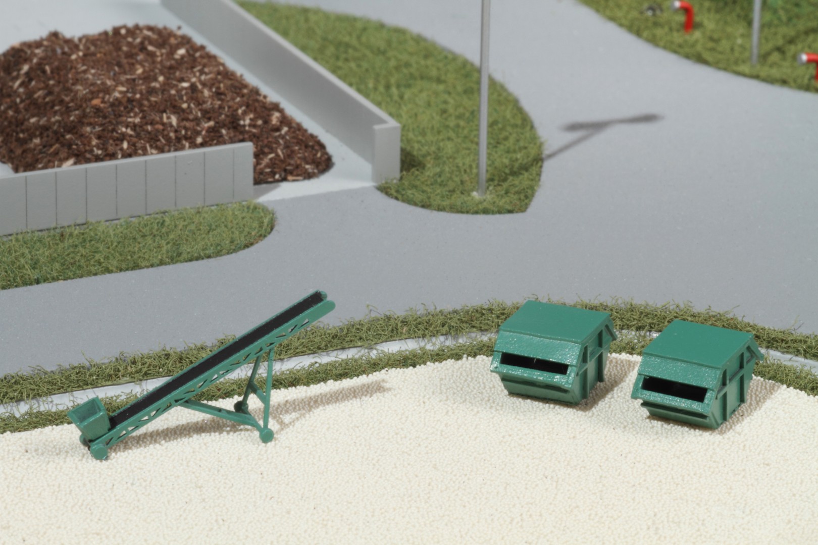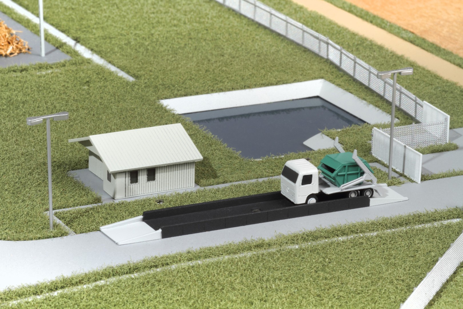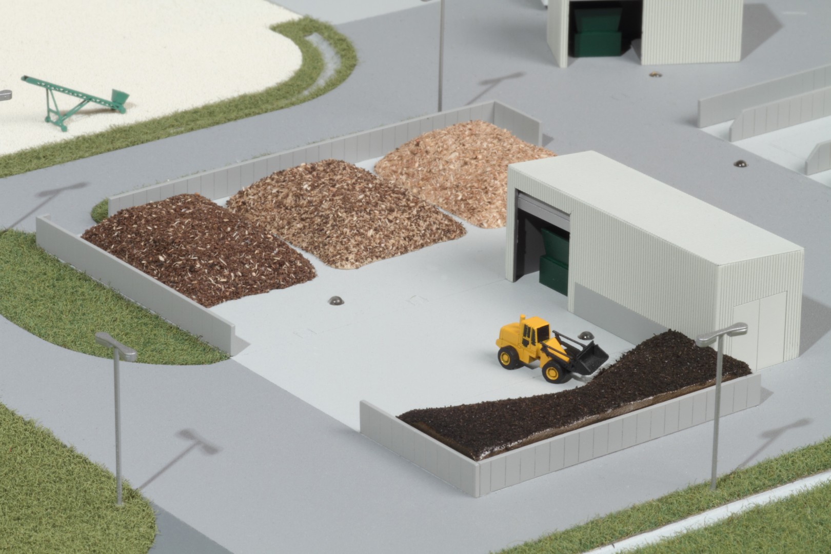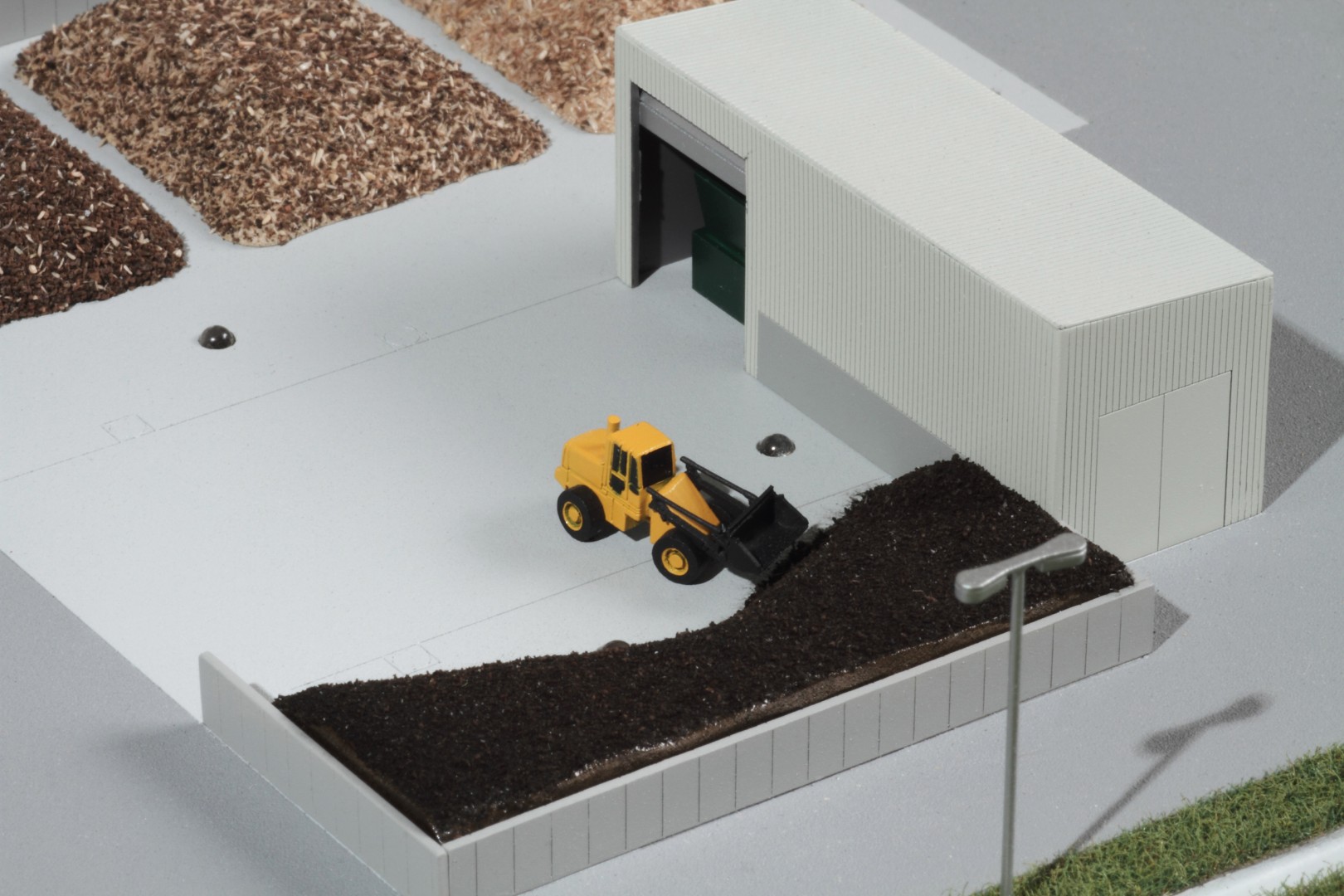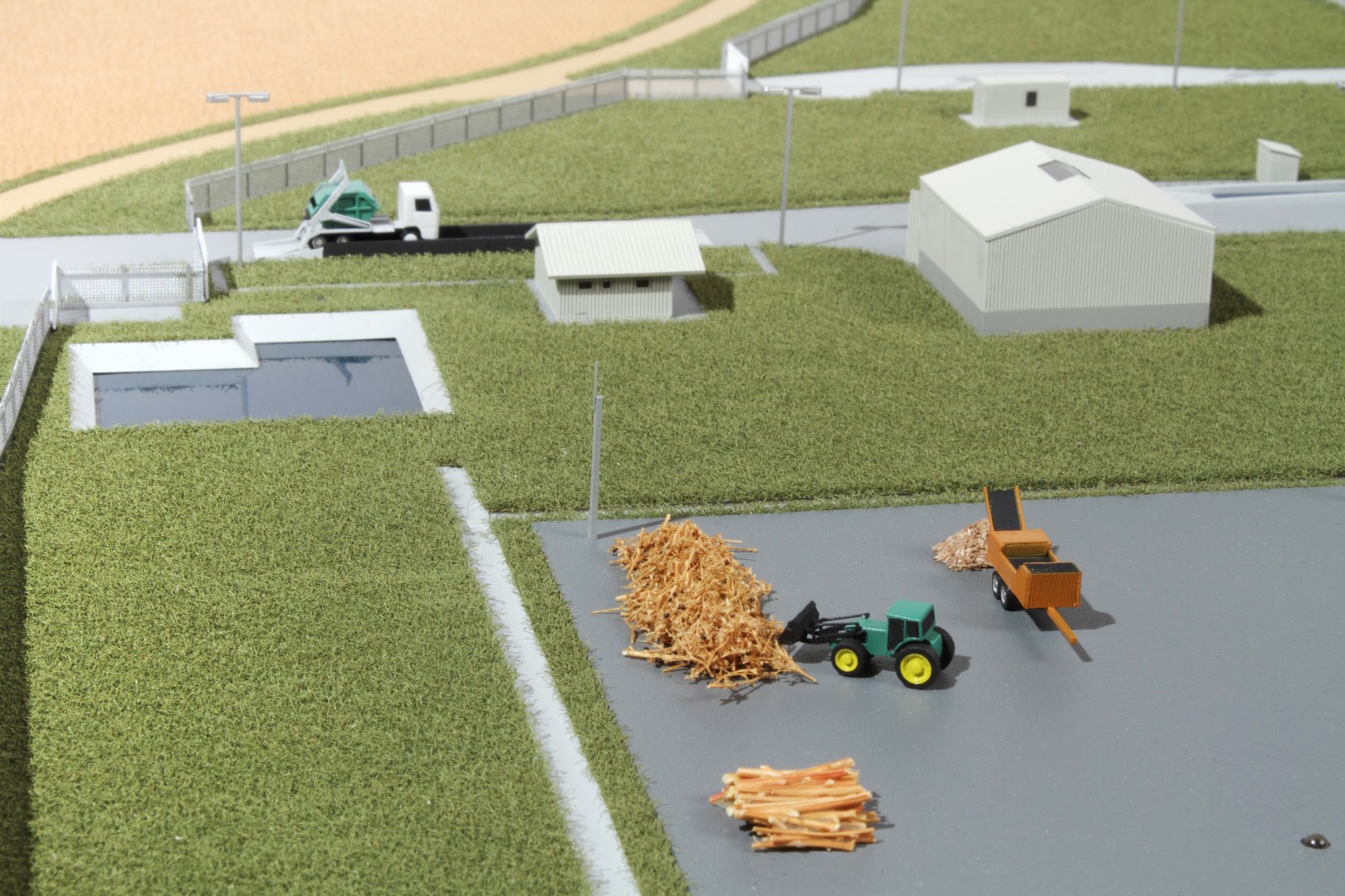 A Vasivíz Zrt. szennyvíztisztító telepén a biológiai folyamatok végén olyan szerves iszap keletkezik, ami további faaprítékkal keverve, rövid időn belül alkalmassá válik a mezőgazdasági talajerő visszapótlásra. A Vasivíz Zrt. figyelmet fordít a magas színvonalú technológiáinak szemléletes bemutatására, így a szennyvíztisztító mellett, a komposztáló telepéről is elkészíttette információs makettjét. Itt az egyes folyamatok nyomonkövethetőségét segítve magyarázó LED világítást készítettünk. A megbízás különös volt abból a szempontból, hogy ezen a telepen minden „kupacnak” jelentősége van, fontos a mérete, alakja, és még a színe is. Ez utóbbi jól látható a makett közepén található keverékeknél, amik a bennük található faapríték mennyiségében térnek el egymástól. Makettünkön 300 szoros kicsinyítésben egy üzemszerű állapotot mutatunk, ahol egy traktor épp táplálja a gigászi méretű faaprítót, egy homlokrakodó keveri a faaprítékkal az iszapot, egy másik már az elkészült komposztot deponálja, ami mellett egy sci-fi filmbe illő Topturn x53 keveri át a prizmában tárolt félkész komposztot. A járművek elkészítését különösen élveztük. A kicsit is hozzáértők már a színűk alapján felismerik a John Deere traktort, vagy a JCB homlokrakodót. A lézergépünk segítségével a Mercedes kamionra még a logó is felkerült. A járműveket a gyári katalógusuk alapján rajzoltuk meg alkatrészenként, és vágtuk ki plexiből, papírból.